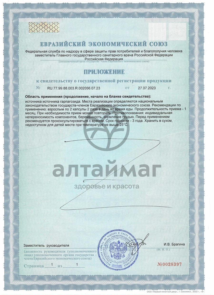 Гидролизат морского (рыбного) коллагена, экстракт травы мартинии душистой в том числе гарпагозид. Вспомогательные вещества: тальк, кремния диоксид, капсула (гидроксипропилметилцеллюлоза).Способ применения